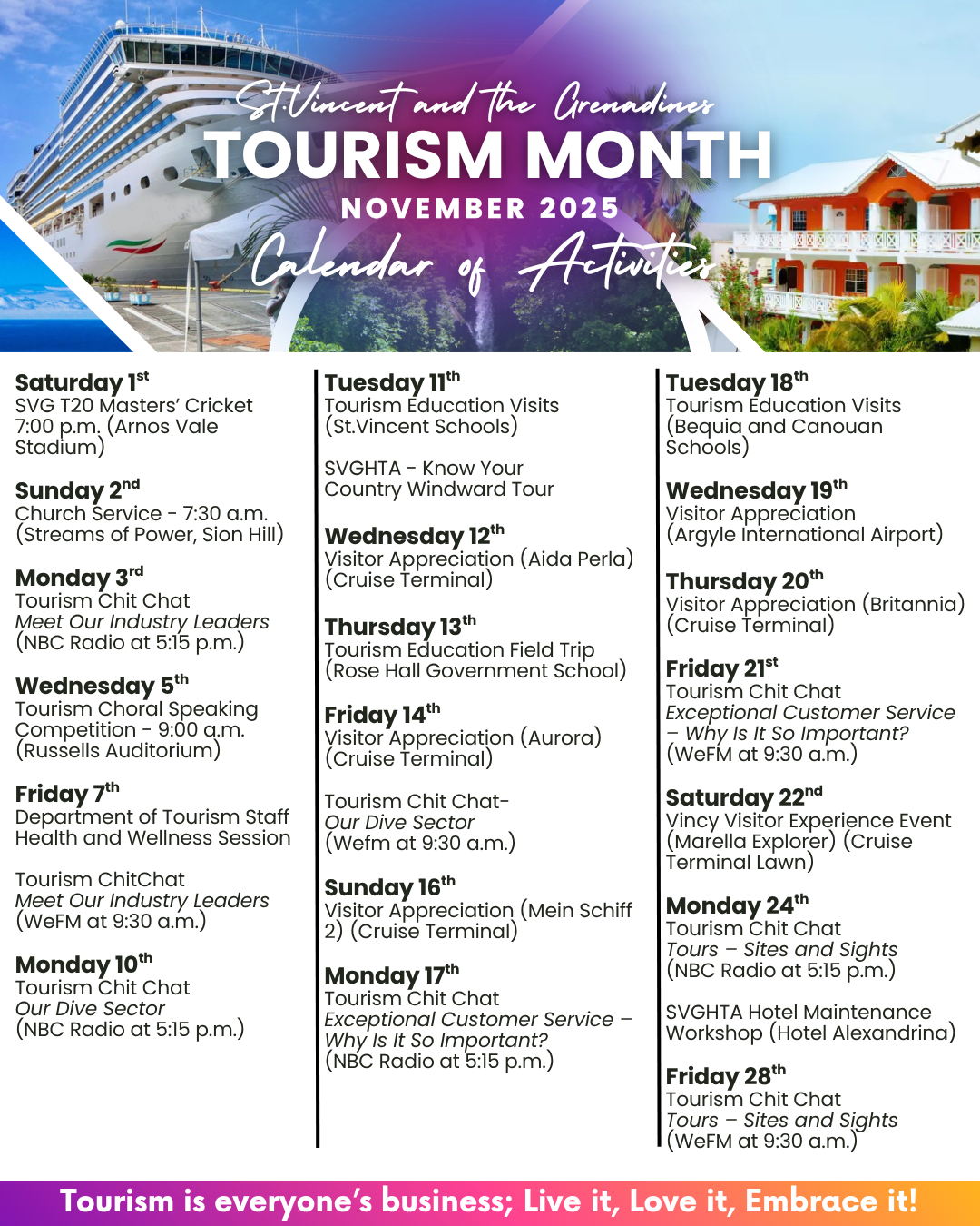 Activities for Tourism Month 2025 include tourism education school visits and field trips, a “Know Your Country” tour, a workshop on hotel maintenance, tourism chit-chat programmes on radio, as well as visitor appreciation days at Kingstown Cruise Terminal and Argyle International Airport. The month will officially commence with a Church Service at the Streams of Power Church in Sion Hill where staff and stakeholders will come together for corporate worship.